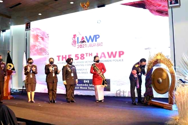 Manggarai Barat, Gatra.com - Kapolri Jenderal Polisi Listyo Sigit Prabowo pada Minggu (7/11) resmi membuka kegiatan konferensi Polwan sedunia yang ke-58 tahun atau The 58th International Assosiation of Momen Police (IAWP) di Labuan Bajo, Kabupaten Manggarai Barat, Provinsi NTT. Pembukaan yang dilaksanakan di Hotel Meruorah ini ditandai dengan pemukulan Gong.