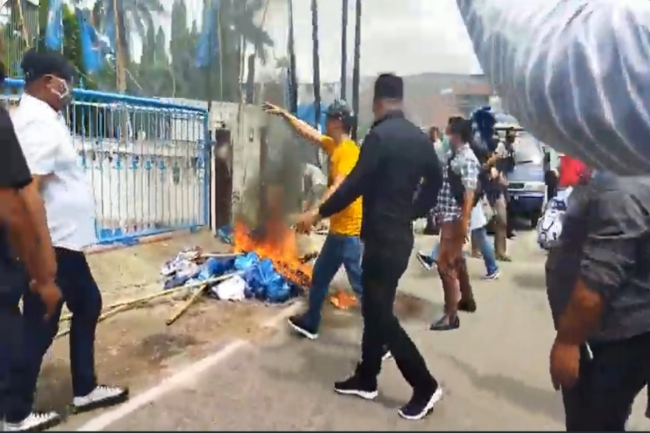 Kupang, Gatra.com- Musda Partai Demokrat NTTOktober 2021 lalu berbuntut. Ratusan orang yang menyebut diri simpatisan petahana Jefry Riwu Kore, Selasa 4 Januari 2022 melakukan aksi membakar atribut Partai Demokrat, baliho dan poster bergambar wajah Ketua Umum Partai Demokrat, Agus Harimurti Yudhoyono (AHY) di depan kantor DPD Partai Demokrat NTT di Jalan Kosasi Kupang.