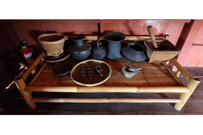 Perabot khas Betawi seperti meja kayu bundar, kursi kayu beranyaman rotan, dan 2 toples kaca menghiasi pojok serambi depan. Agak masuk ke dalam, ruang tamu dengan dua jendela, terdapat 3 kursi kayu, dan sofa kayu untuk dua orang. Lantai dan dinding yang terbuat dari papan kayu membuat ruangan lebih adem. Kamar tidur terletak di sebelah ruang tamu, lengkap dengan tempat tidur berkelambu, serta satu set meja rias. Ke arah belakang saat keluar dari kamar tidur, pengunjung akan masuk ke ruang makan, ruang tengah, dan dapur. Satu set meja makan, beberapa barang seperti rebana, permainan congklak, tikar pandan, dan koper jaman kuno, dipajang di ruang tengah. Untuk keluar dari rumah, penunjung harus turun tangga dari teras belakang.
