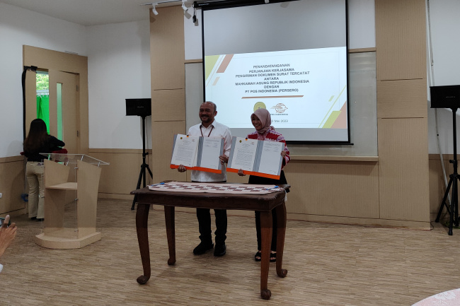 Jakarta, Gatra.com- Mahkamah Agung (MA) menggandeng Pos Indonesia untuk penanganan kiriman dokumen surat tercatat dari semua instansi peradilan di bawah MA melalui jaringan Pos di seluruh Indonesia. Kesepakatan tersebut ditandai dengan dilakukannya penandatanganan kerja sama