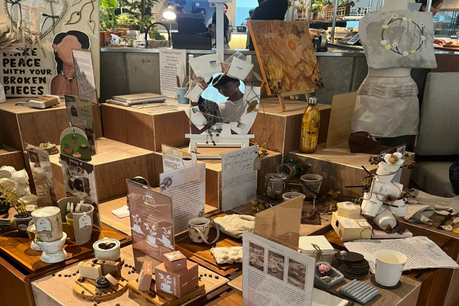Beberapa karya ini adalah buku, lukisan, lilin, sabun, kertas, juga kalung, kaos kaki dan totebag yang pewarnaannya menggunakan ampas kopi. Nah kolaborasi ini membuka peluang untuk menjual merchandise di outlet .TEMU.